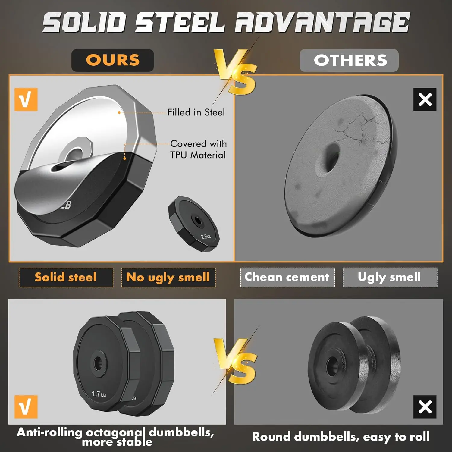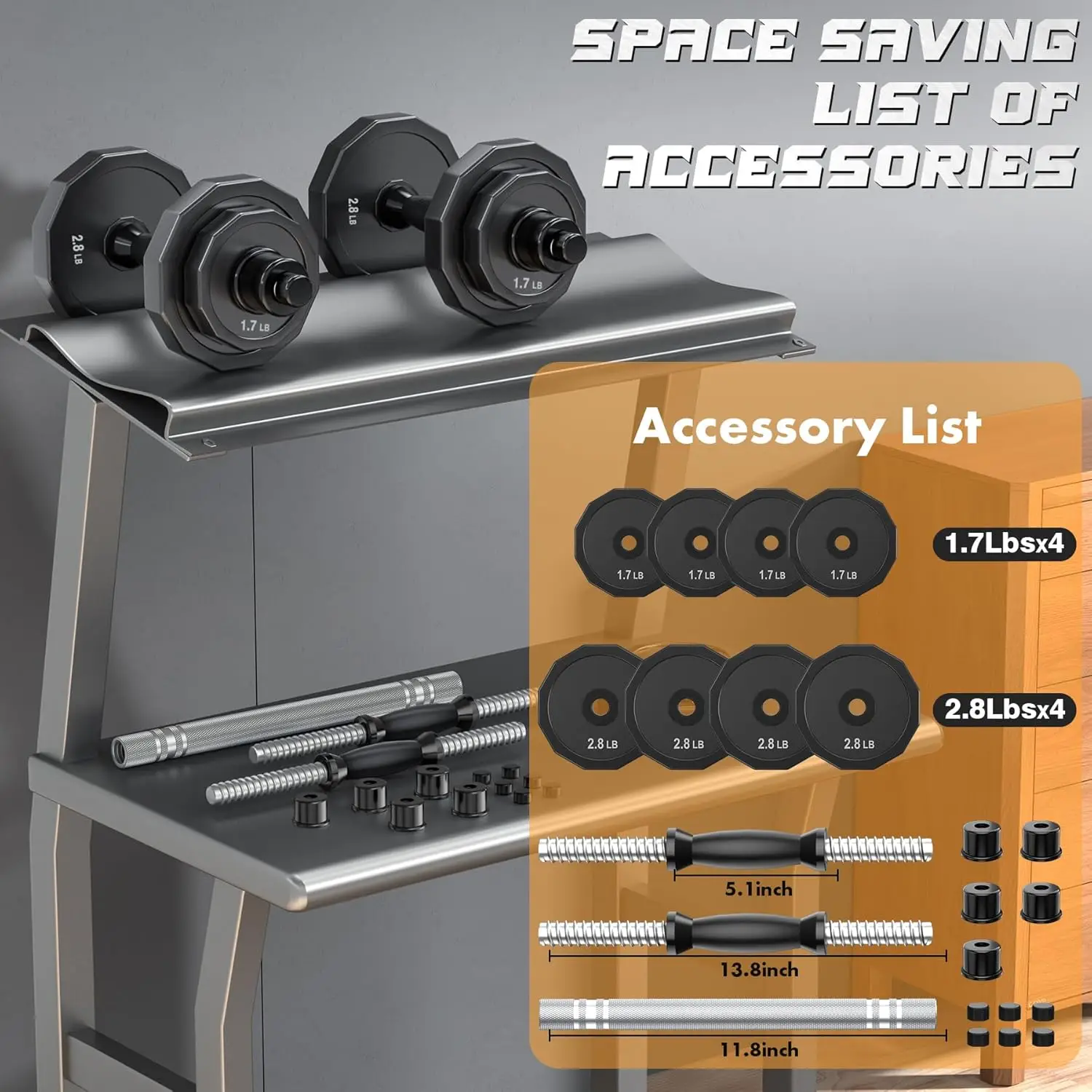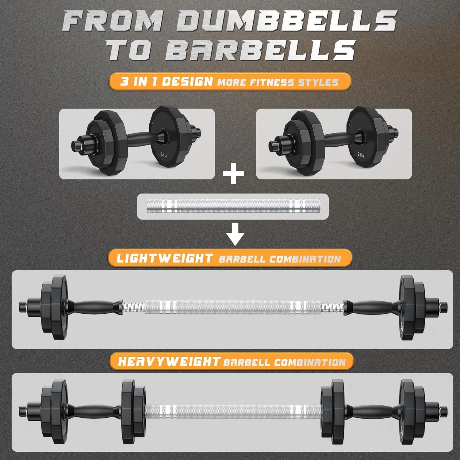 Transform your home into a personal fitness studio with this versatile adjustable dumbbell set! Perfect for strength training, fat burning, and body shaping, this comprehensive kit adapts to your evolving workout needs. **Key Features That Make This Set Exceptional:** • **Fully Adjustable Weight System**: Easily customize your load from 5.6lbs to 22lbs per dumbbell, with total set options reaching 22Lbs, 44Lbs, 66Lbs, or 88Lbs. The included connecting rod lets you assemble a full barbell for enhanced muscle engagement. • **Premium Solid Steel Construction**: Unlike cheaper cement-filled alternatives, our weight plates are crafted from durable solid steel—thinner yet remarkably stable with true-to-weight accuracy. Each plate is coated in high-security TPU material that’s unbreakable, soundproof, and floor-friendly. • **Ergonomic & Safe Design**: Polygonal plate shapes prevent rolling for easy storage and safer use. Knurled chrome handles ensure a firm grip, while rubber-coated ends minimize slipping during intense sessions. • **Space-Saving Solution**: Ideal for apartments or compact home gyms! Quickly disassemble after workouts and tuck the components under furniture—no bulky racks required. It’s perfect for fitness novices and seasoned enthusiasts alike. **Why This Dumbbell Set Elevates Your Fitness Journey:** Achieve full-body conditioning without expensive gym memberships! Whether you’re targeting arms, legs, chest, or core muscles, this adaptable set supports diverse exercises like curls presses squats rows—and more Use it solo as dumbbells or combine into a barbell for compound lifts The adjustable design grows with your strength helping you progressively overload safely **Complete Package Includes Everything You Need:** 4 x 1.7 lbs counterweight plates | 4 x 2.8 lbs counterweight plates | 5 x spinlock collars | 6 x protective end caps | 2 x handle bars | 1 x knurled chrome connector rod Start training immediately—no extra purchases necessary! **Ideal For:** • Home workout enthusiasts seeking professional-grade equipment • Beginners building foundational strength safely • Busy individuals needing compact versatile gear • Anyone pursuing weight loss muscle toning or general fitness goals Take the first step toward a healthier stronger you today Click ‘Add to Cart’ now and unlock limitless workout possibilities right in your living room!